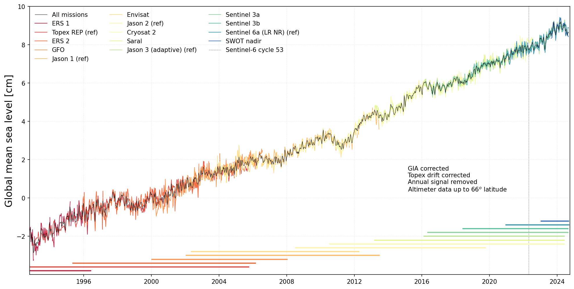 El seguiment per satèl·lit del nivell del mar va començar el 1991 amb la missió ERS-1 (1991-2000), i ha continuat amb les missions TOPEX/Poseidon (1992-2006), ERS-2 (1995-2011), GFO (1998-2008), Jason 1 (2001-2013), Envisat (2002-2012), Jason -2 (2008-2019), CryoSat-2 (2010-actualitat), SARAL (2013-2024), Jason-3 (2016-actualitat), Sentinel-3A (2016-actualitat), Sentinel-3B (2018-actualitat), Sentinel-6A (2020-actualitat), i SWOT (2022-actualitat).